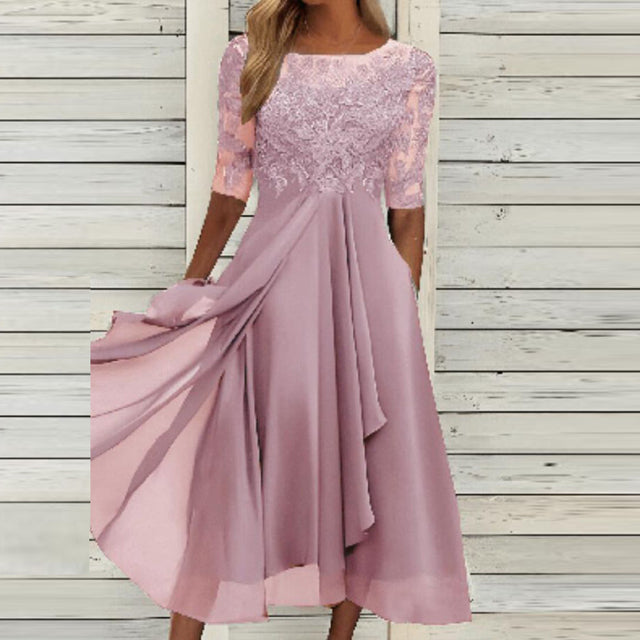 Denna fantastiska A-linje balklänning har en utsökt spetsbroderi på livet och delikata transparenta ärmar. Den flödande flerlagerskjolen tillför en touch av elegans, medan den runda halsringningen med ett genomskinligt överlager förstärker dess charm. Denna klänning är perfekt för sommarevenemang och erbjuder en blandning av stil och komfort.